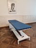 Sehr gut erhaltene Hess Untersuchungsliege Base Line 2, Liegefläche 2-teilig, Rückenteil stufenlos verstellbar. Elektrisch mit Fusstaster verstellbar. Enzianblau. Papierrollenhalter.
